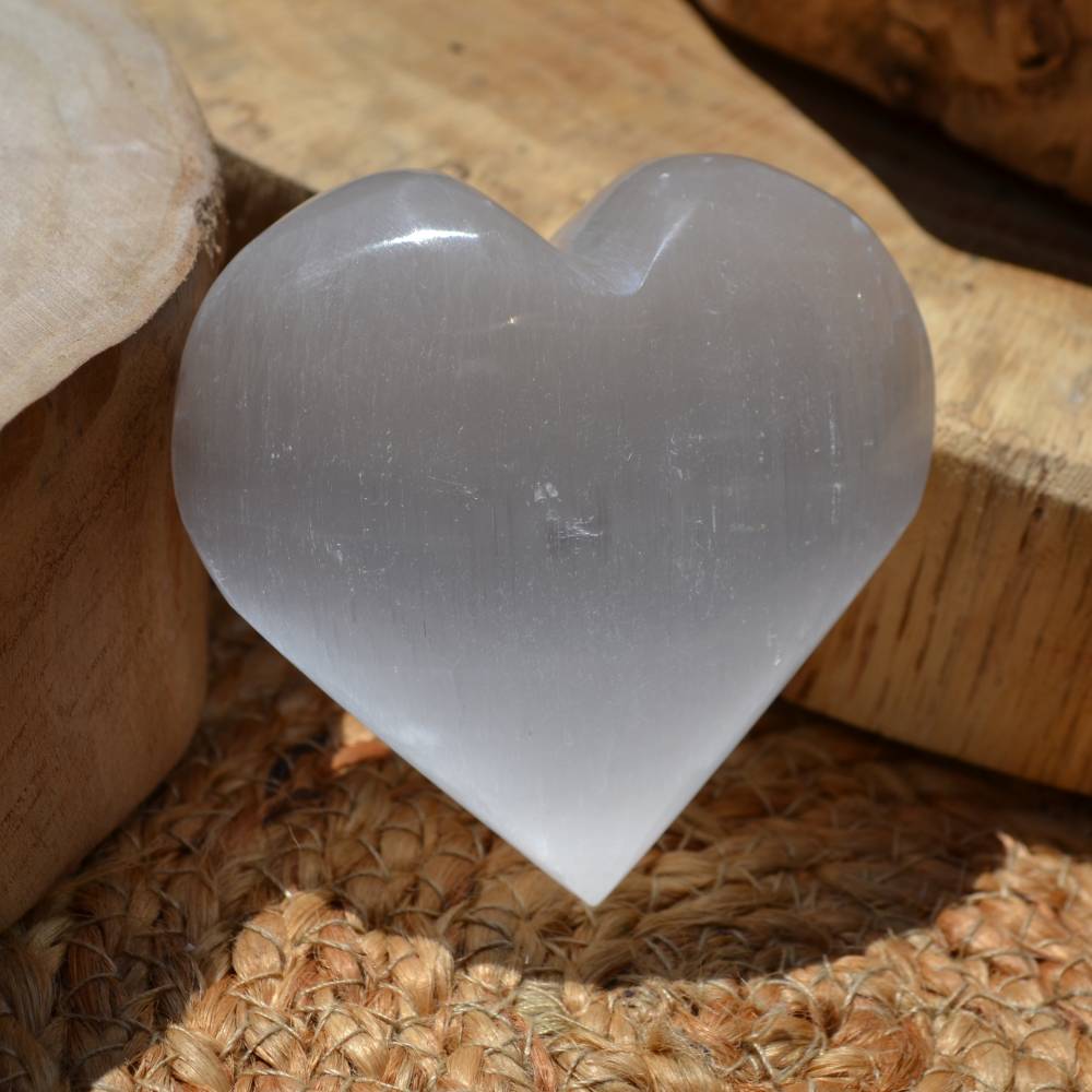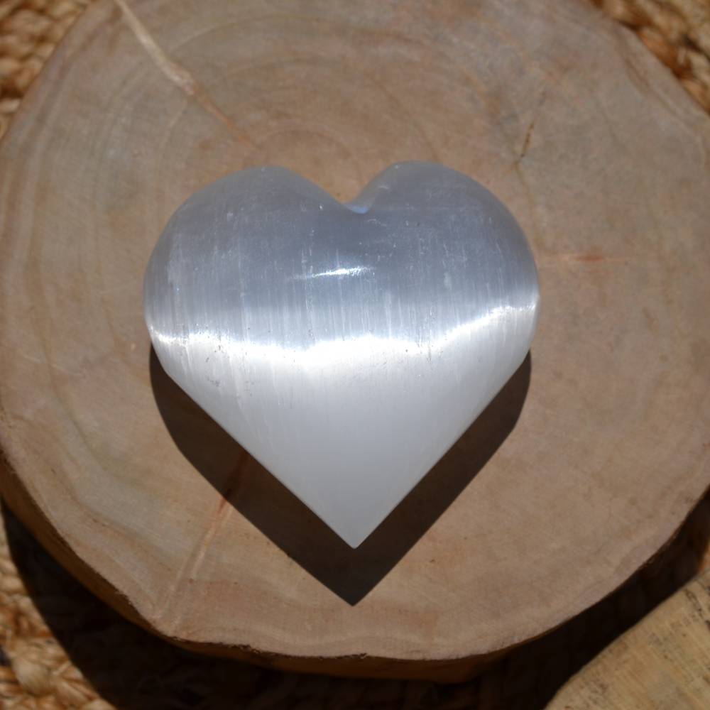 Magnifique cœur de Sélénite d'un poids de 181 g. Cette pièce est unique, vous recevez la pierre en photo.