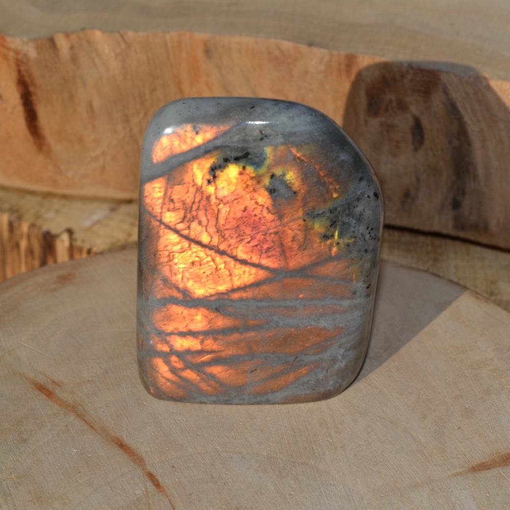 Labradorite dorée : Variété de Labradorite de couleur jaune translucide. Associée à une Topaze Bleue, elle relie le plexus solaire à la gorge et améliore l’expression de notre moi, de notre avis et de nos sentiments. Associer à du Quartz Rose sur le chakra du cœur elle facilite l’expression générale.